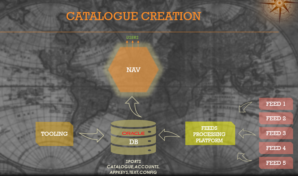 Before talking about how we expose the product catalogue, a quick intro into how the product catalogue is actually created and managed through its lifecycle. We receive the feeds and notifications from various official providers and partners about the scheduling of real world events, like football fixtures or horse races, over vastly different mechanisms, ranging from files being FTP’d, polling APIs and push interfaces. As you can imagine sifting through all of this humongous amount of real world information and distilling them into a set of unique betting events and markets, is a complicated task in itself and probably warrants a description in a separate blog in itself. But suffice to say for now, that the data goes through several layers of filtering, transformations and distillations over several platforms before being clarified into a single generic model that is stored in a centralised Oracle DB.